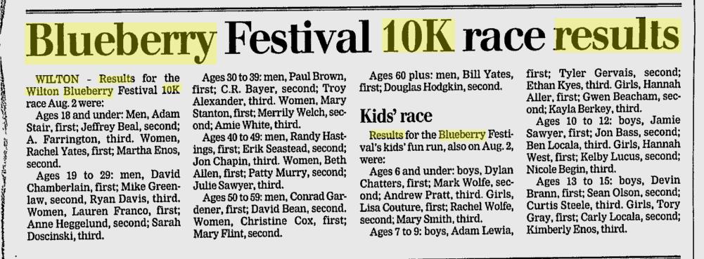 | Aug 2 | 20th Wilton Blueberry 10K | Wilton |