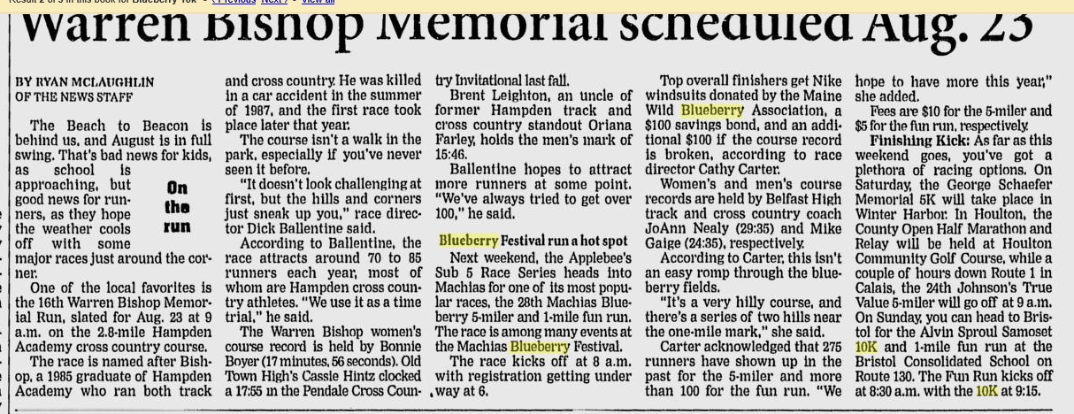 Perhaps missed deadlines. No listing in Bangor newspaper for Wilton Blueberry 10K