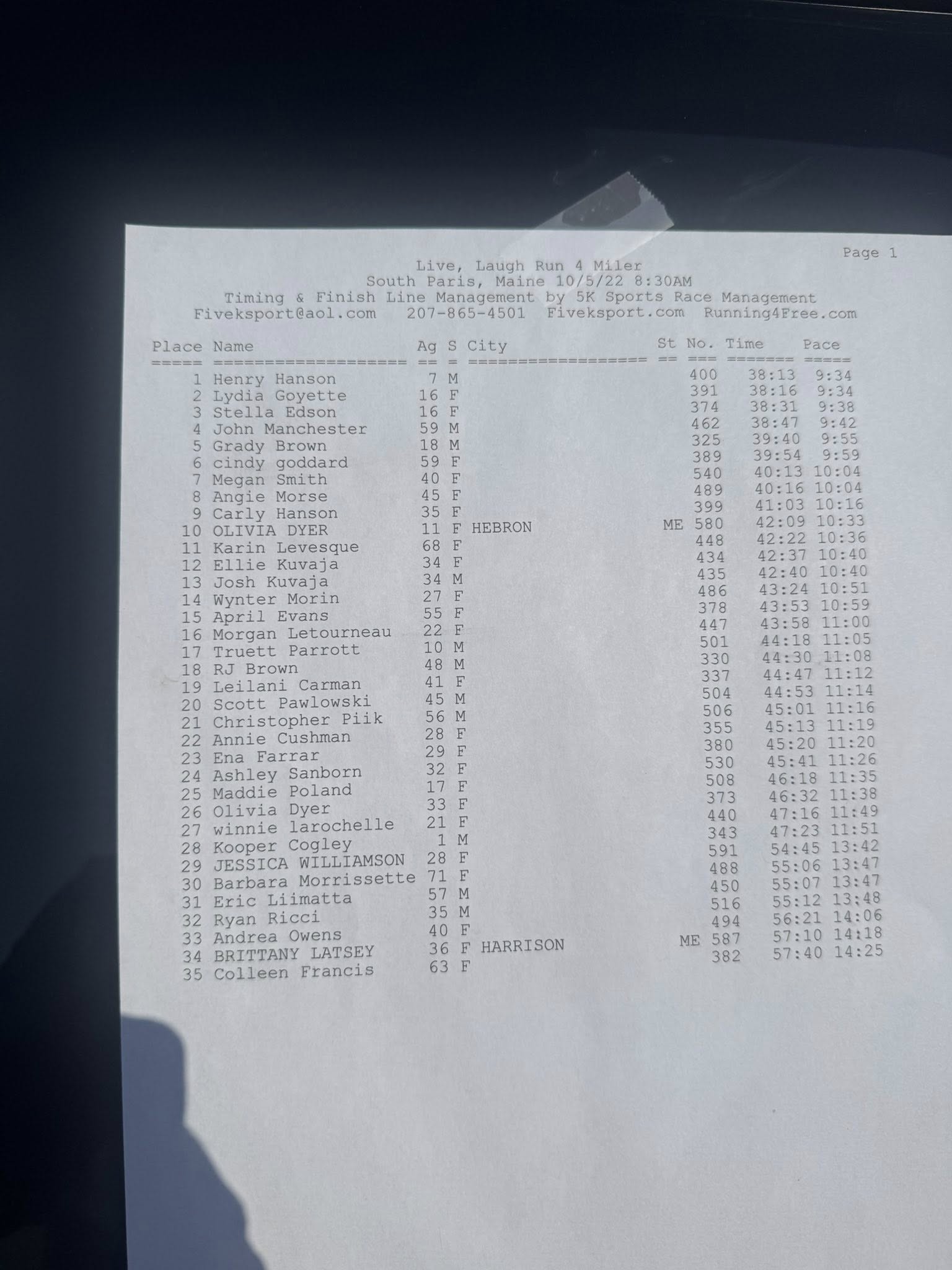 I can never find the online results for this race as they are buried somewhere deep inside Bowdoin’s website. I did find last years’ results today, but couldn’t find them last year. The results are in the pictures and are in order even though they are not numbered. The pictures do overlap slightly. You may have to zoom in to read the names.